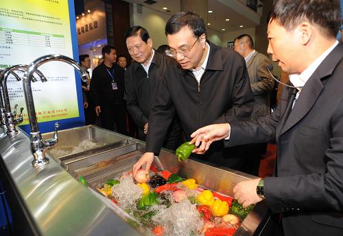 下午3時許,李克強與中共中央政治局委員、北京市委書記劉淇一同來到展覽現場,仔細觀看一件件實物、一個個模型、一幅幅圖片,認真聽取工作人員介紹。在中央主造型區、政府節能展區,李克強詳細了解有關情況,對近年來全國及北京市節能環保工作的成效表示充分肯定。他指出,節能減排是推動科學發展的重要任務,也是促進產業升級的重要途徑。要加大結構調整力度,推進企業改造重組,提升能源使用效率和產業發展水平,提高經濟增長質量和效益。在觀看十大重點工程、水泥廠余熱余壓利用、污泥焚燒、企業用電用熱在線監測平臺等項目和技術展示時,李克強說,要進一步增加節能環保投入,加快企業技術改造,推行節能產品和服務,培育新的經濟增長點。