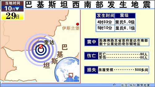 新華網北京10月29日電 國家主席胡錦濤29日就巴基斯坦俾路支省發生強烈地震造成重大人員傷亡和財產損失,向巴基斯坦總統扎爾達里致慰問電。
