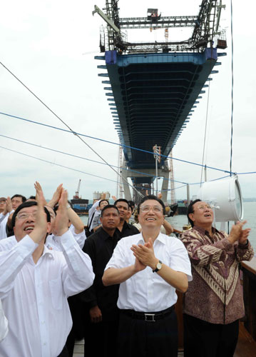 李克強說,中國在一些重大基礎設施方面具有明顯的國際市場競爭優勢。他要求有關部門從財政、金融信貸等方面對企業給予支持。李克強向正在橋上施工的中方工程技術人員和工人揮手致意,勉勵他們保證質量,注意安全,高標準地完成建設任務,不負祖國的托付,把大橋建成中國和印尼人民之間的友誼之橋。
