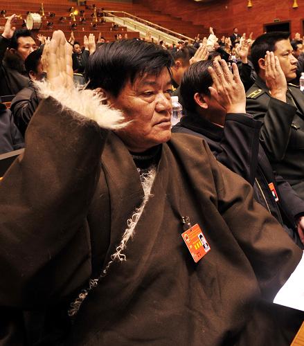 1月19日,西藏自治區人大代表、昔日農奴格桑和與會其他代表表決通過《西藏自治區人民代表大會關于設立西藏百萬農奴解放紀念日的決定》。當日,西藏自治區九屆人大二次會議決定,將每年的3月28日設為西藏百萬農奴解放紀念日。新華社記者 格桑達瓦 攝