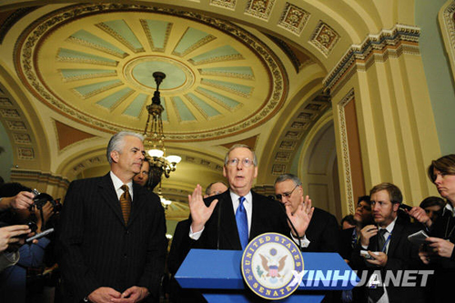 2月10日,美國國會(huì)參議院少數(shù)黨領(lǐng)袖麥康奈爾(中)在國會(huì)山出席記者會(huì)。當(dāng)日,美國國會(huì)參議院在最終投票中以61票對37票的投票結(jié)果,批準(zhǔn)了總額為8380億美元的經(jīng)濟(jì)刺激計(jì)劃。新華社記者張巖攝