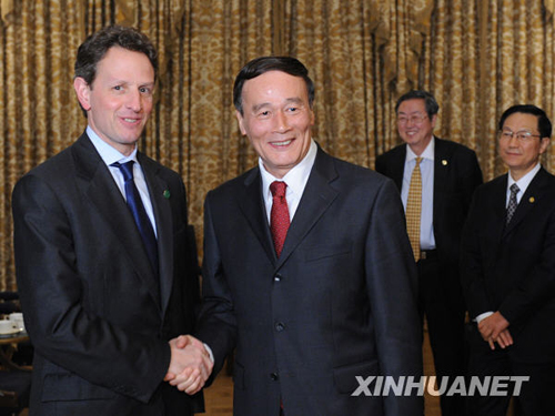 資料圖片:4月2日,中國國務院副總理王岐山陪同國家主席胡錦濤出席二十國集團領導人第二次金融峰會期間在倫敦會見美國財政部長蓋特納。 新華社記者李學仁攝