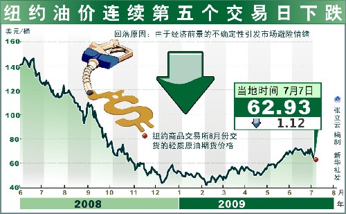 本周二,紐約商業交易所8月期輕質低硫原油合約下跌1.12美元,收于62.93美元/桶,跌幅為1.7%。這一收盤位已創下5月26日以來的新低,盤中8月合約更一度跌至62.35美元。ICE期貨交易所布倫特原油期貨合約結算價則跌82美分,至每桶63.23美元,跌幅1.2%。
