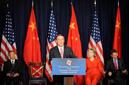 7月28日,中國國務院副總理王岐山(前)在美國首都華盛頓發(fā)表首輪中美戰(zhàn)略與經濟對話閉幕聲明。當天,首輪中美戰(zhàn)略與經濟對話在華盛頓閉幕,中國國家主席胡錦濤特別代表、國務院副總理王岐山和國務委員戴秉國與美國總統(tǒng)巴拉克·奧巴馬特別代表、國務卿希拉里·克林頓和財政部長蒂莫西·蓋特納共同主持了為期兩天的對話。新華社記者 申宏 攝