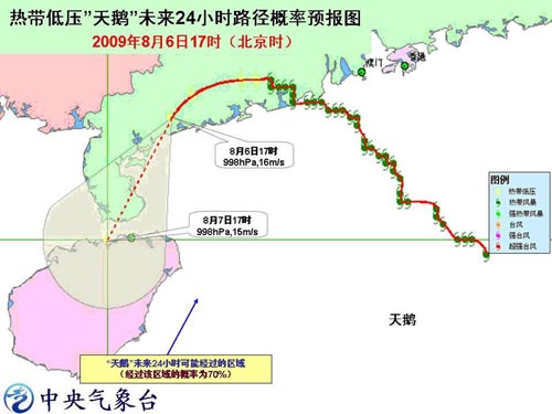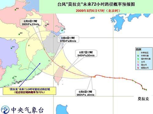 中央氣象臺預計,“莫拉克”將以每小時15公里左右的速度向西偏北方向移動,強度繼續加強,并逐漸向臺灣東北部一帶沿海靠近,有可能于明天晚上到后天早晨擦過或登陸臺灣東北部沿海地區,然后向福建北部到浙江中部一帶沿海靠近。