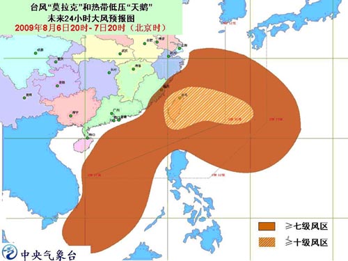 受“莫拉克”影響,今天晚上到明天白天,臺灣以東洋面、東海大部海面、臺灣海峽、巴士海峽、巴林塘海峽、臺灣省及其沿海、福建中北部沿海、浙江沿海將有7~10級大風,“莫拉克”中心經過的附近海面的風力有11~15級;浙江東部、福建東北部、臺灣等地有大到暴雨,其中,福建東北部沿海、浙江東南部沿海以及臺灣等地的部分地區有大暴雨,臺灣東北部的局部地區有特大暴雨。