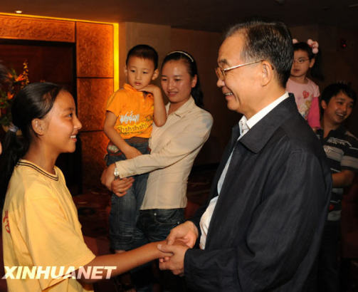 9月25日,中共中央政治局常委、國務(wù)院總理溫家寶在綿陽邀請四川地震災(zāi)區(qū)部分基層干部群眾會面。這是溫家寶親切地拉著在北川中學(xué)初中一年級讀書的羌族小女孩劉小樺的手,詢問她的學(xué)習(xí)和生活情況。新華社記者黃敬文攝