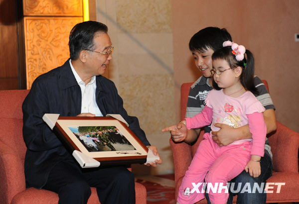 9月25日,中共中央政治局常委、國務(wù)院總理溫家寶在綿陽邀請四川地震災(zāi)區(qū)部分基層干部群眾會面。這是溫家寶拿著照片,向4歲的宋馨懿(右)講述他在北川縣城外為剛剛獲救的小馨懿讓路的情景。新華社記者黃敬文攝