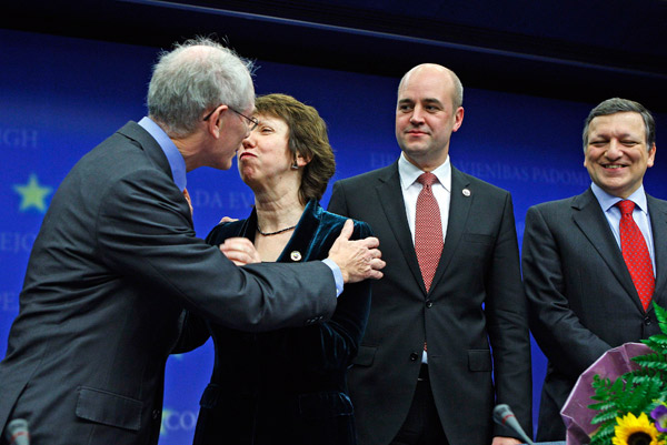 范龍佩,阿什頓與歐盟輪值主席、瑞典首相賴因費爾特,歐盟委員會主席巴羅佐一起出現在峰會后舉行的新聞發布會上。賴因費爾特說:“今天,我們選出了將帶領歐洲走向未來的領導人。”他說,經過廣泛交流和磋商,兩位人選在選舉中獲得歐盟成員國的一致支持。