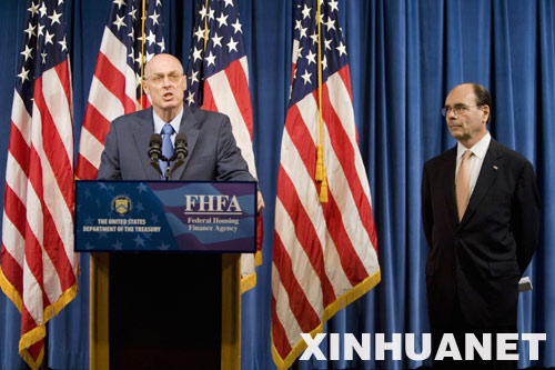 資料圖片:2008年9月7日,美國財(cái)政部長保爾森(左)和聯(lián)邦住房金融局局長詹姆斯洛克哈特在新聞發(fā)布會(huì)上宣布,美國政府接管陷入困境的美國兩大住房抵押貸款融資機(jī)構(gòu)房利美和房地美。新華社發(fā)