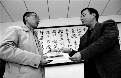 小張(左)從全國“掃黃打非”辦公室負(fù)責(zé)人黃曉新手中接過獎金。記者蒲東峰攝