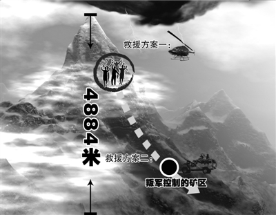 據了解,還有兩個方式走出原始秘境。一是乘坐直升機,但每天如約而至的大暴雨根本沒有適合直升機飛行的條件。二是穿過當地叛軍控制的礦區。但這需要有過硬背景的探險公司與政府武裝聯合,喬裝成礦工用軍車乘夜間護送。途中還需要很大一筆費用來打點當地的武裝分子,這樣才能順利通行。這些條件缺一不可,否則,很有可能被當地非政府武裝扣押。7名隊員一直認為這一路徑十分冒險。但如果不能原路返回,穿越礦區就成為登山隊員走出原始秘境的一條捷徑。