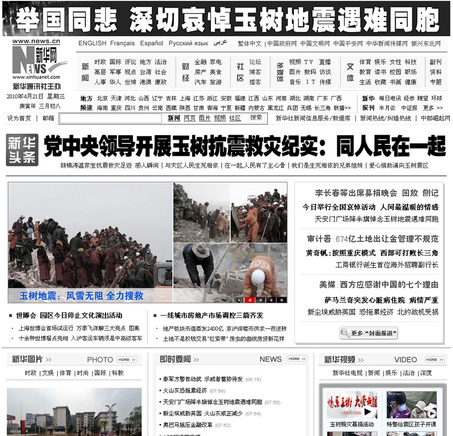 在這個(gè)全國(guó)哀悼遇難同胞的日子,網(wǎng)絡(luò)上一切與娛樂(lè)有關(guān)的活動(dòng)將全部暫停,悼念玉樹(shù)遇難同胞的主題活動(dòng)相繼展開(kāi)。今天,新華網(wǎng)、人民網(wǎng)、搜狐、新浪等各大網(wǎng)站將紛紛蒙上黑灰色的面紗以托哀思。