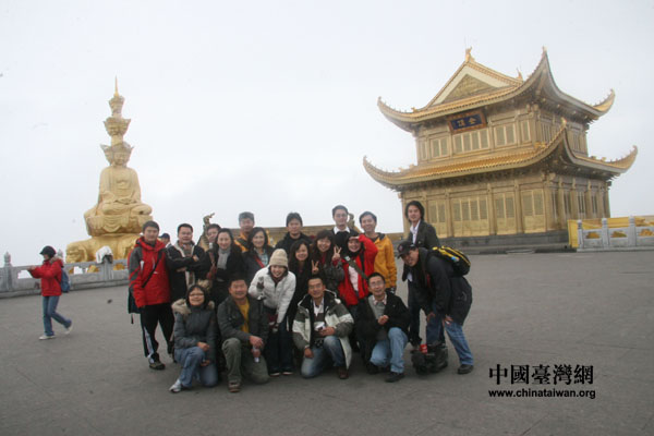 臺灣媒體記者們在金頂前合影留念(攝影:陳寧)