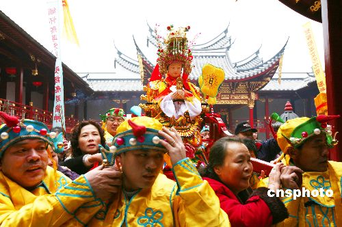 1月24日,由福州馬尾區政府投資近千萬元重建的世界唯一一座船政天后宮竣工。當日上午,兩岸宗教界有關人士和媽祖信徒舉行船政天后宮竣工和恭迎媽祖金身安座儀式。據了解,船政天后宮將于春節期間,即可向公眾開放。背景資料:這座始建于1868年春季、耗資3082兩白銀的船政天后宮,在歷次戰亂中屢遭不測,最終在1971年被拆毀。為弘揚船政文化,福州市馬尾區政府決定重建船政天后。2005年10月開工,在原址上按原比例擴大1/3規模重建,總用地面積7205平方米,建筑總面積1500平方米,門樓高12米、面闊27.22米,主殿5開間,進深8.3米。總體布局為一軸二進二院。一進為門樓,恢復原貌;下中庭為戲臺,上中庭為拜閣;二進為供奉媽祖及配神的大殿。后院為魁星閣等。按天后宮的原有格局、組織結構形成歷史脈絡,共分三個功能區:祭媽祖廟宇區、接待陳列與附屬設施區和休閑區。 中新社發 汪虎 攝