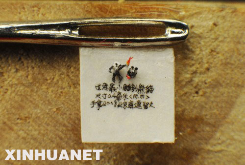 臺(tái)灣著名雕刻藝人陳逢顯用了6個(gè)月的時(shí)間,用樹脂為材料,在針鼻大的地方,成功雕刻出兩件熊貓與奧運(yùn)相結(jié)合的微雕作品,以此表達(dá)他盼望北京成功舉辦奧運(yùn)會(huì)的心情。圖為陳逢顯先生雕刻的手拿奧運(yùn)圣火的熊貓,熊貓尺寸為0.4毫米,作品上方為針鼻(3月18日攝)。 新華社記者 陳樹根 攝