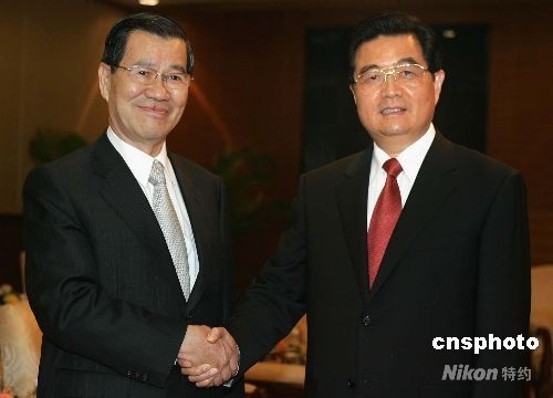 4月12日下午,國(guó)家主席胡錦濤在海南省博鰲會(huì)見(jiàn)出席博鰲亞洲論壇2008年會(huì)的兩岸共同市場(chǎng)基金會(huì)董事長(zhǎng)蕭萬(wàn)長(zhǎng)。 中新社發(fā) 任晨鳴 攝