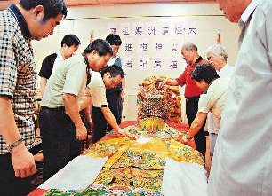 中新網5月28日電 臺灣云林縣西螺廣福宮日前至大陸湄洲島進香謁祖,祖廟感念分靈多次“探親”,特致贈媽祖金身神袍,歷史上百年,全臺僅此一件。廣福宮如獲至寶,昨天展示,吸引不少民眾爭睹祖靈風采。