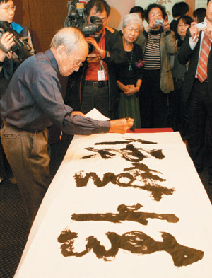 曾跟隨溥儀二十年的毓嶦,自幼喜歡書法,師承近代名家陳增壽、汪鸞翔等,以行草自成一家,是愛新覺羅家族中碩果僅存的書法大家,昨天他將寫著“雅靜”兩字的作品送給文建會,另當眾揮毫寫了“情無價”。