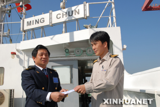 12月17日,廈門海事部門工作人員為“明春”輪船長頒發(fā)入港手續(xù)辦妥通知單。 新華社發(fā)