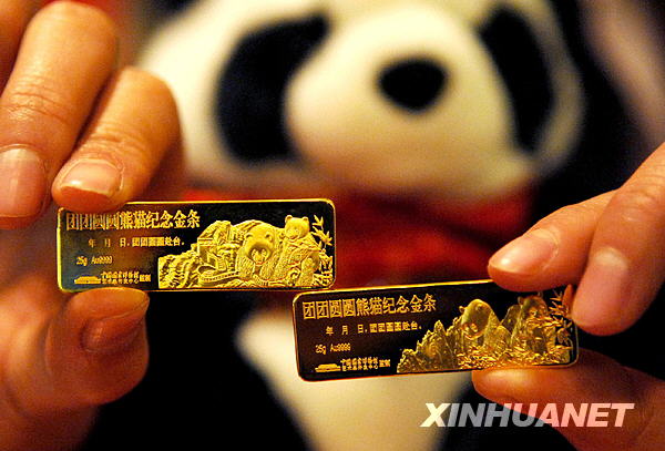 當日,由中國國家博物館藝術品開發中心監制的“團團圓圓熊貓紀念金條”在北京正式面市,以紀念大熊貓“團團”、“圓圓”12月23日赴臺。這款金條每套兩根,面向大陸和臺灣地區同步發行,主題圖案均為大熊貓“團團”和“圓圓”,背景則分別是萬里長城和阿里山。新華社發