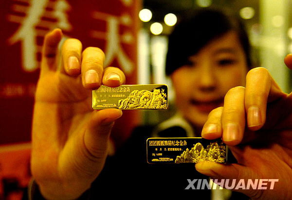 12月22日,工作人員展示“團團圓圓熊貓紀念金條”。