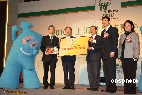 “二0一0年上海世界博覽會推介會”于四月六日在臺北舉行。臺灣“中國旅行社”被宣布成為上海世博會臺灣地區門票的指定代理商,上海世博會的吉祥物“海寶”及票樣亦首次在臺灣亮相。圖為上海世博會事務協調局副局長陳先進(右二)在臺北推介會上,向臺灣地區門票指定代理商臺灣“中國旅行社”董事長周慶雄(左二)贈門票、授匾牌。 中新社發 耿軍 攝