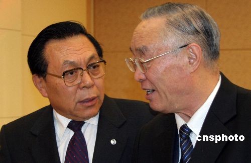 資料圖:2008年十一月十二日下午,中國繞月探測工程總指揮欒恩杰(右)、繞月探測工程科學應用首席科學家歐陽自遠院士,在中國首幅全月球影像圖發布儀式上交流。當日,國家國防科技工業局在北京正式發布依據“嫦娥一號”衛星拍攝的月球地形地貌數據制作而成的中國第一幅全月球影像圖。 中新社發 孫自法 攝