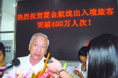 2009年7月10日,陳信仲作為廈金航線第400萬名旅客正在接受媒體采訪。 葉明亮 鄭曉強 攝 (資料圖片)