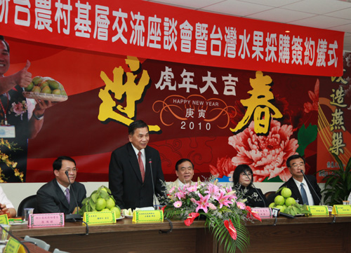 座談會上,浙江省天臺縣石梁鎮(zhèn)石梁村等5個村的村長與高雄縣的5個村結(jié)為友好村坊,建立了長效交流對接機制。浙江省從高雄農(nóng)戶手中現(xiàn)場采購鳳梨5000箱、香蕉2600箱、芭樂1600箱、芒果1800箱,并簽訂了總價值人民幣1500萬元的農(nóng)產(chǎn)品采購合同。