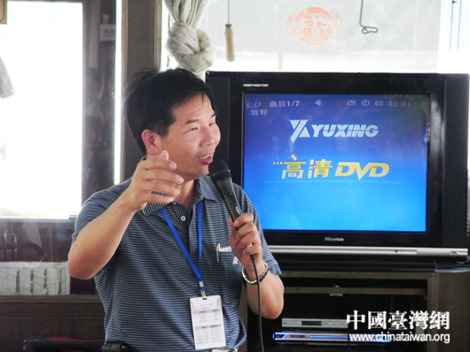 臺灣書法家、臺中市文化局長陳志聲用唐音古韻吟詠自己寫的歌頌漓江的詩 (中國臺灣網 蕪同 攝)