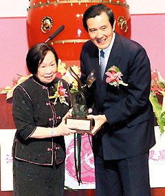馬英九頒發“兩岸和平特殊貢獻獎”給前海基會董事長辜振甫夫人辜嚴倬云女士。圖片來源:臺灣《經濟日報》