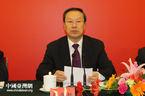 全國政協(xié)副主席、中共中央統(tǒng)戰(zhàn)部部長、中國和平統(tǒng)一促進會執(zhí)行副會長杜青林出席會議并講話。(中國臺灣網(wǎng) 趙輝 攝)