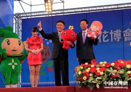 中共陜西省西安市市委書記孫清云與臺北市長郝龍斌互換園藝會吉祥物(陜西省臺辦 張群莉 攝)