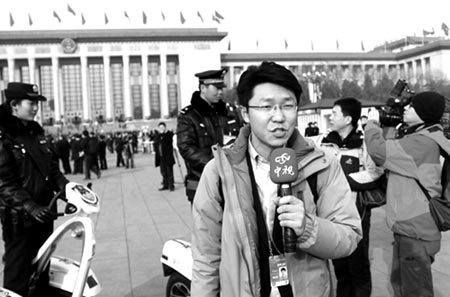 3月5日,臺灣中視記者在天安門廣場報道新型警察巡邏車。圖片來源:國際在線網站