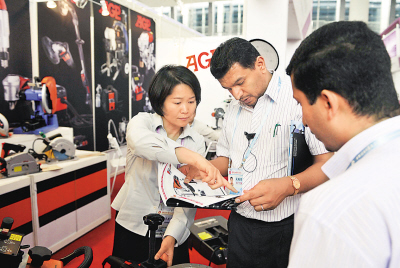 4月16日,一家生產(chǎn)專業(yè)電動工具的臺企參展商(左)在第109屆廣交會上向采購商介紹產(chǎn)品。 新華社記者 陳曄華 攝