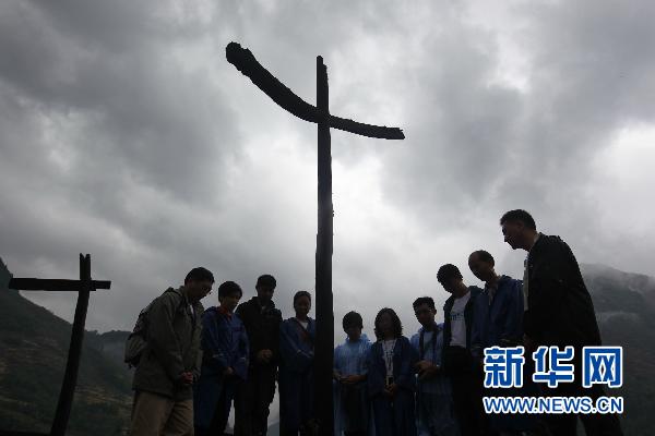 資料圖片:5月9日,在“5.12”汶川地震重災區四川省青川縣東河口地震遺址公園,在青川參加災民安置房援建工作的香港迪士尼樂園的志愿者在雨中默哀。 新華社記者 任正來 攝