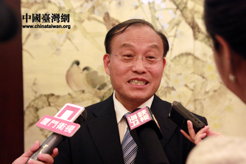 第四屆津臺投資合作洽談會暨2011天津·臺灣名品博覽會新聞發布會7月5日在津舉辦。臺北世貿中心副秘書長黃文榮接受記者采訪。(中國臺灣網 馬迪 攝)