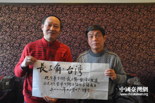 作為上海臺協贈送給海基會江丙坤董事長“吉地和風”國畫作品的作者、大陸書畫名家楊華耀先生聞訊華廣網上海站成立,欣然提筆書寫了“長三角-臺灣”五個大字。(中國臺灣網發 玉龍 攝)