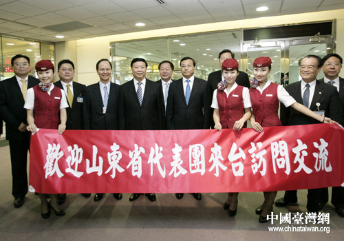 2011年7月11日,山東省長姜大明乘山航班機抵達臺灣桃園機場時,受到臺灣長榮航空公司董事長和山航乘務人員的歡迎。(圖片來源:山東省臺辦)