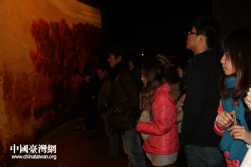 兩岸大學生們認真觀看新石器時期河姆渡人的生活還原圖。(中國臺灣網 郭瑩瑩 攝)