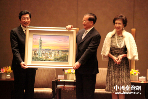 連戰向郭金龍贈送畫有臺北101高樓的油畫(中國臺灣網 趙輝 攝)