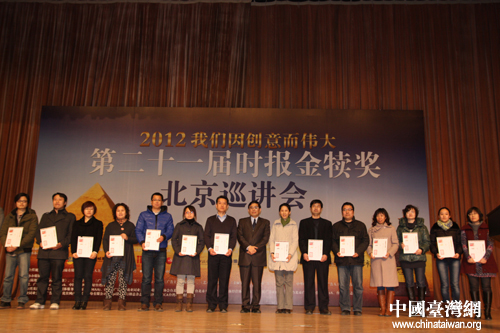 中國臺灣網3月7日北京消息  今天下午,第21屆時報金犢獎首場巡講會在中國傳媒大學如期舉行;該獎行走海峽兩岸21年、培養了無數廣告創意人才。當天,來自北京、天津、河北等省市的30余所高校的近千名師生代表與會,高漲的參與熱情溫暖了北京的早春。