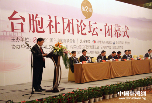 中國臺灣網(wǎng)5月13日北京消息 5月11日至12日,由中華全國臺灣同胞聯(lián)誼會主辦的、以“進(jìn)一步發(fā)揮臺胞社團(tuán)作用,促進(jìn)兩岸關(guān)系和平發(fā)展”為主題的“第二屆臺胞社團(tuán)論壇”在北京舉行。來自海峽兩岸、港澳及海外的160多家臺胞社團(tuán),260余位社團(tuán)領(lǐng)袖和代表們出席了本屆論壇,與會代表圍繞“加強(qiáng)兩岸經(jīng)貿(mào)交流,深化兩岸經(jīng)濟(jì)合作”、“深化兩岸文化交流,共同弘揚(yáng)中華文化”、“充分發(fā)揮臺胞社團(tuán)作用,深化兩岸關(guān)系和平發(fā)展”三個(gè)議題積極思考,踴躍發(fā)言。論壇牢牢把握兩岸關(guān)系和平發(fā)展的新形勢,明確了臺胞社團(tuán)新任務(wù),匯聚了廣泛共識,取得了可喜成果。