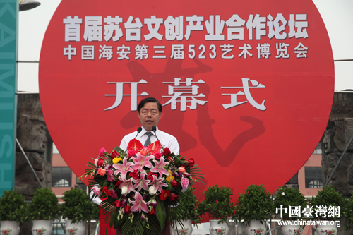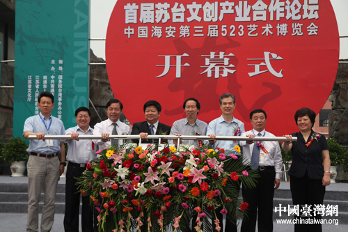 中國臺灣網(wǎng)6月6日南通消息 首屆蘇臺文創(chuàng)產(chǎn)業(yè)合作論壇暨中國海安第三屆523藝術(shù)博覽會6日上午在江蘇省海安縣隆重開幕,來自海峽兩岸及海內(nèi)外的近千位嘉賓歡聚一堂,共同探討加強蘇臺文化交流,促進兩岸文創(chuàng)產(chǎn)業(yè)合作。國臺辦主任助理龍明彪、信息中心主任仇開明,文化部文化產(chǎn)業(yè)司司長劉玉珠,江蘇省臺辦副主任石細云,南通市委書記丁大衛(wèi)等出席開幕式。