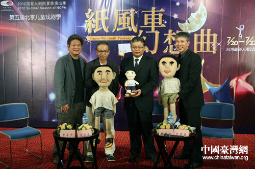 6月28日下午,臺灣紙風車劇團在國家大劇院召開新聞發布會,臺灣知名導演吳念真(左二)、《紙風車幻想曲》總編導李永豐(左一)等與劇中角色“阿欽”合影。(中國臺灣網 于斯文 攝)