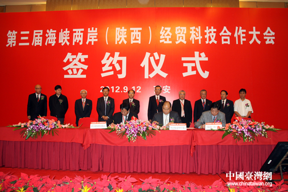 中國臺灣網9月12日西安消息 第三屆海峽兩岸經貿科技合作大會12日上午在陜西省西安市隆重召開。兩岸560多位嘉賓匯聚一堂,共商陜臺兩地經貿科技合作大計。在會議現場,來自陜臺兩地的幾十家企業一共簽署了十個項目的投資合作協議,總簽約金額超30億人民幣。