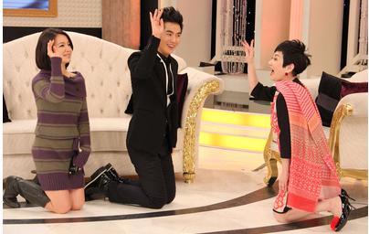 張曉龍(中)8日教張小燕(右)古代禮儀,讓小燕難得在節(jié)目中“下跪”。圖自臺媒