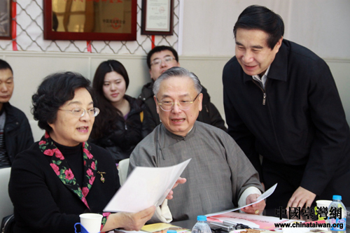黃梅邨先生向林文漪、黃志賢展示他精心準備的新年禮物。(中國臺灣網(wǎng) 王怡然 攝)