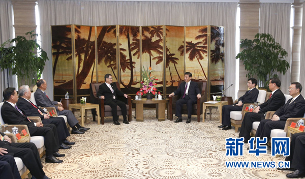 4月8日,中共中央總書記習近平在海南省博鰲會見臺灣兩岸共同市場基金會榮譽董事長蕭萬長一行。 新華社記者 龐興雷 攝